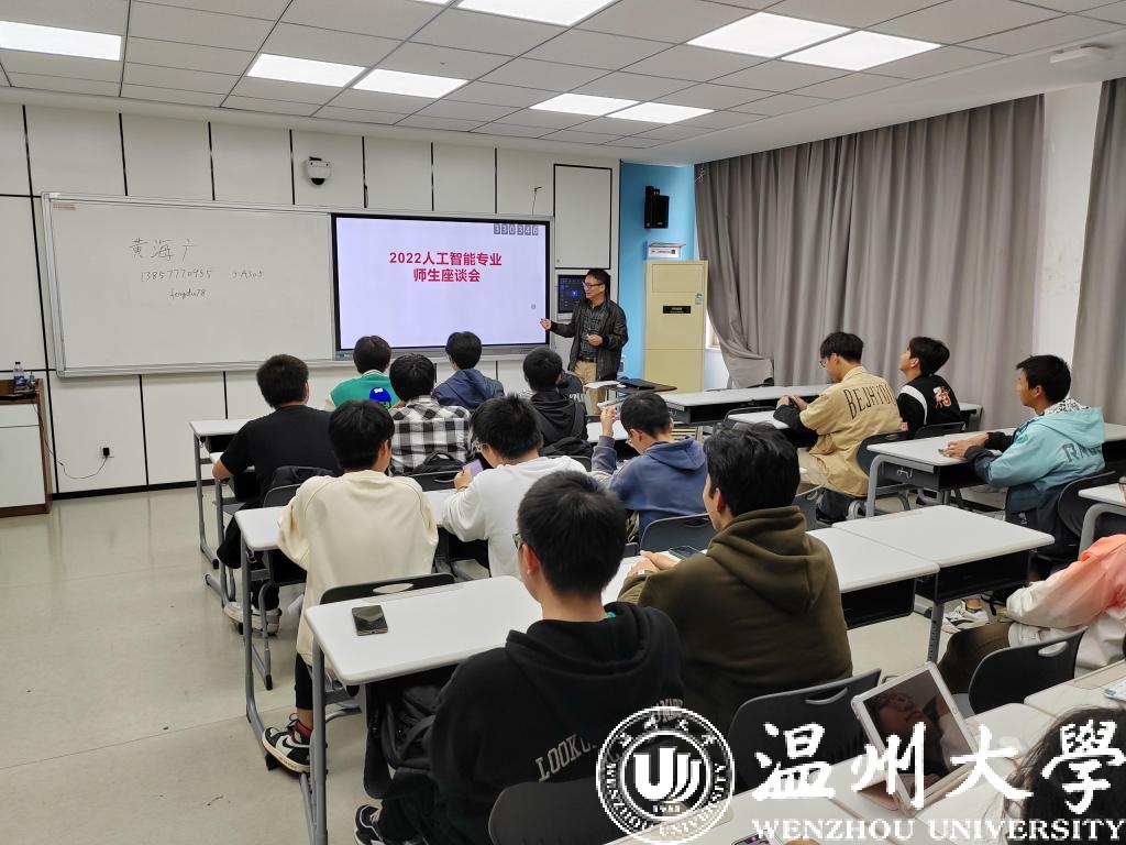 为加强教学管理,提升教学质量,无翼鸟 人工智能系于2022年11月3日下午在5A303召开2022-2023学年第一学期大一新生座谈会。人工智能系黄海广、罗胜、何才透、张潮力、潘志勇、张楠、叶林伟等老师,以及学生代表近30人参加了座谈会。座谈会由人工智能系主任黄海广主持。