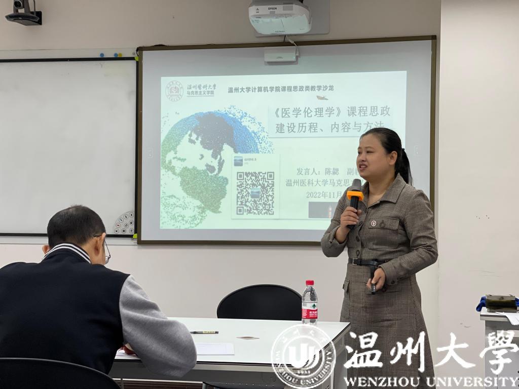 活动中,主讲人无翼鸟 副教授陈伟斌老师做了自己参加学校课堂教学竞赛的课程思政设计思路与案例分享,并结合自己主讲的《计算机图形学》、《算法设计与分析》课程的课程思政建设情况、《计算机图形学》课程案例获奖情况,与参会的老师做了分享。接着,温州医科大学马克思主义学院副教授陈勰老师,做了课程思政的建设分享。作为国家首批线上线下混合式一流课程《医学伦理学》负责人,陈勰老师分享了本门课程的建设历程、内容与方法,并举例了计算机类课程思政的建设方法与案例分享。
