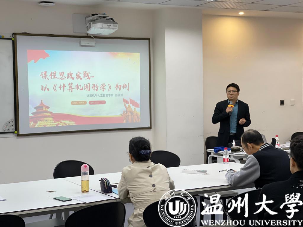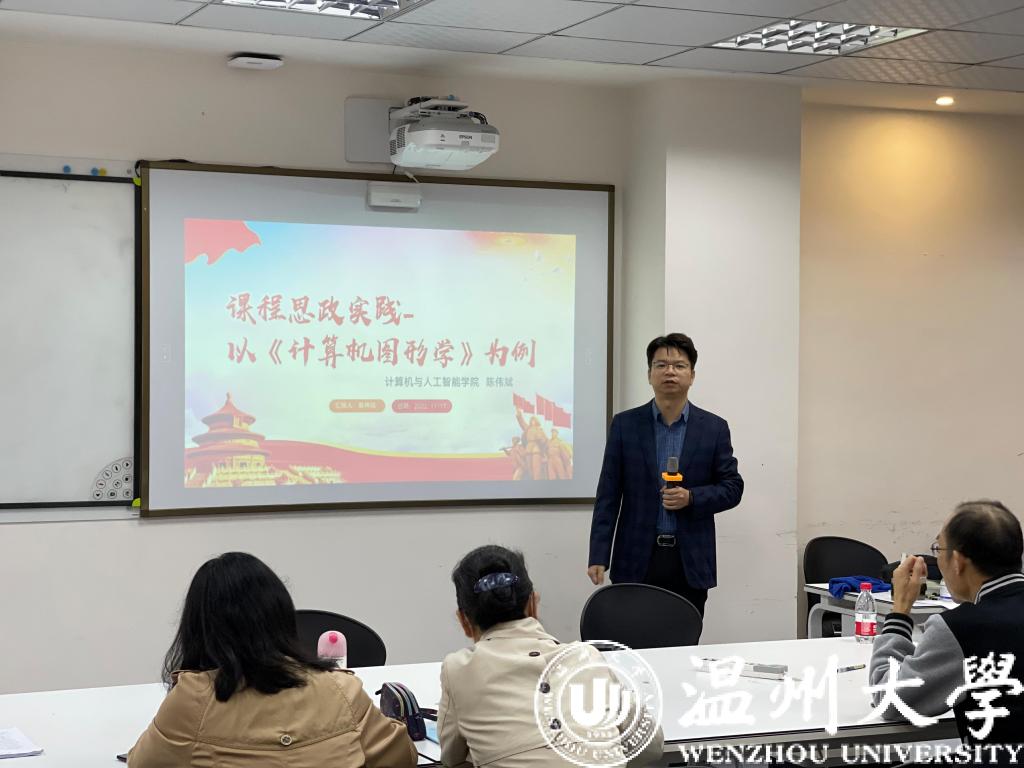 11月17日上午在5B206多功能教室,计算机系主任、2020年校教师课堂教学竞赛二等奖获得者陈伟斌老师主讲了《课程思政实践-以计算机图形学为例》的课程思政沙龙活动,本次活动也是本年度的明心示范课。本次沙龙由学院副院长黄辉老师主持,还邀请了温州医科大学马克思主义学院医学伦理学教研室主任陈勰副教授担任助讲嘉宾。来自全校无翼鸟 、化材学院、电气与电子学院共15名教师参加了本次沙龙。
