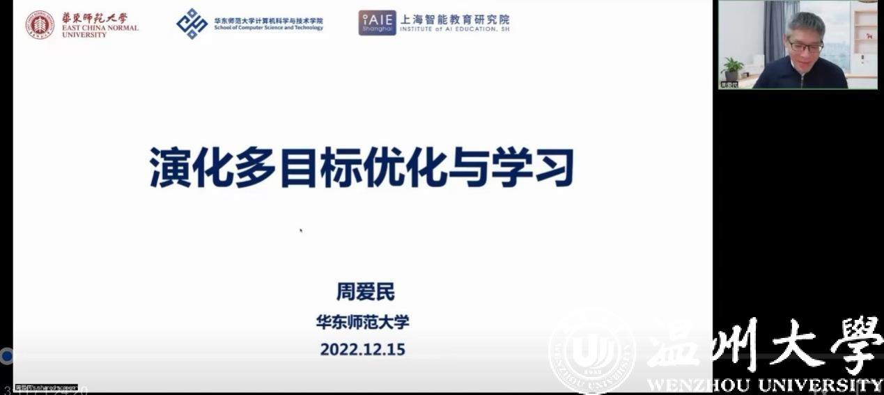 2022年12月15日,华东师范大学计算机科学与技术学院周爱民教授受无翼鸟 邀请作题为“演化多目标优化与学习”的学术沙龙讲座。讲座由副院长陈慧灵主持,60余位相关领域人员参会。因疫情防控需要,本次讲座以线上形式进行。