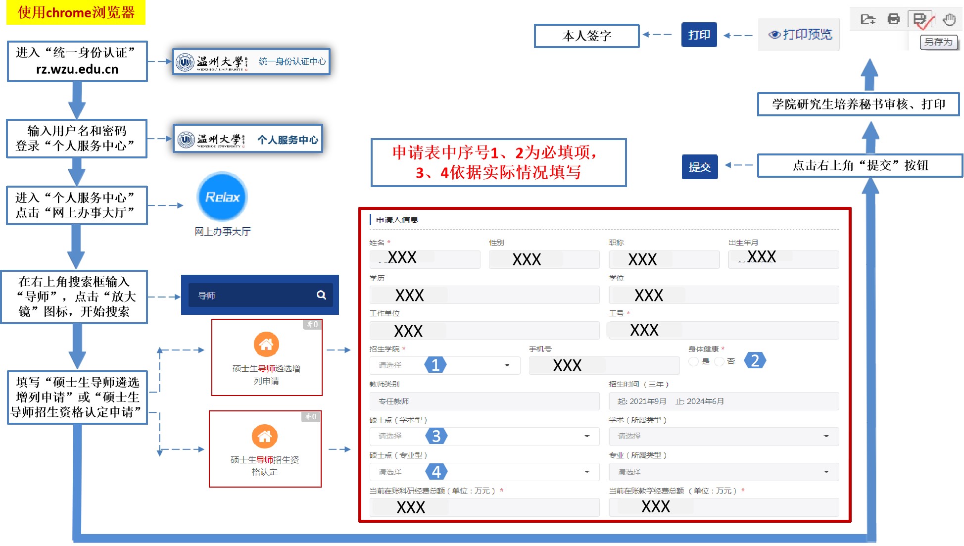 (一)为提高工作效率,简便申请人手续,研究生院启用学校信息技术中心开发的“网上办事大厅”,申请人需要填写和提交的材料大为减少。填表时可通过手机端“我的温大” APP直接申请,或通过电脑端申请(推荐使用谷歌 Chrome浏览器)。具体操作详见上述流程图,如遇到系统技术问题请咨询信息技术中心(彭老师86596091)。