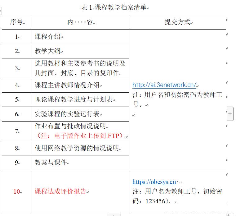 2022-2023-1学期课程结束后,请将本科课程教学档案上传到无翼鸟 课程档案系统(//ai.3enetwork.cn/,课程教学档案清单详见表1),其中,电子版作业上传到ftp://10.132.219.5:2019的“2022-2023-1课程作业”文件夹中(命名格式:班级+课程名+姓名),纸质版作业每个评分等级各交2份到教务科胡孙贵老师处;课程达成评价报告需登录毕业要求达成度评价系统(//obesys.cn,操作手册详见附件2)进行填写,所有材料上传截止日期:2023年2月23日(下学期开学前3天内)。
