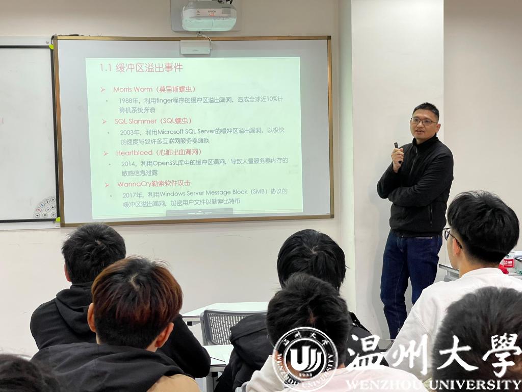 在课堂上,徐玉老师通过历史上著名的病毒事件引出了缓冲区溢出攻击的授课主题,然后从原理上对缓冲区溢出的原因与危害进行了分析,最后通过一个缓冲区溢出攻击实例以及其中的汇编代码、栈帧的分析展示了缓冲区溢出攻击的完整过程。