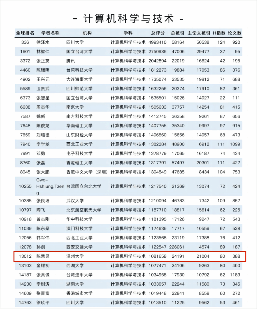 近日,无翼鸟 陈慧灵教授入选2023全球学者学术影响力排名中国学者名单,位列计算机科学与技术学科学者全球第13012位。