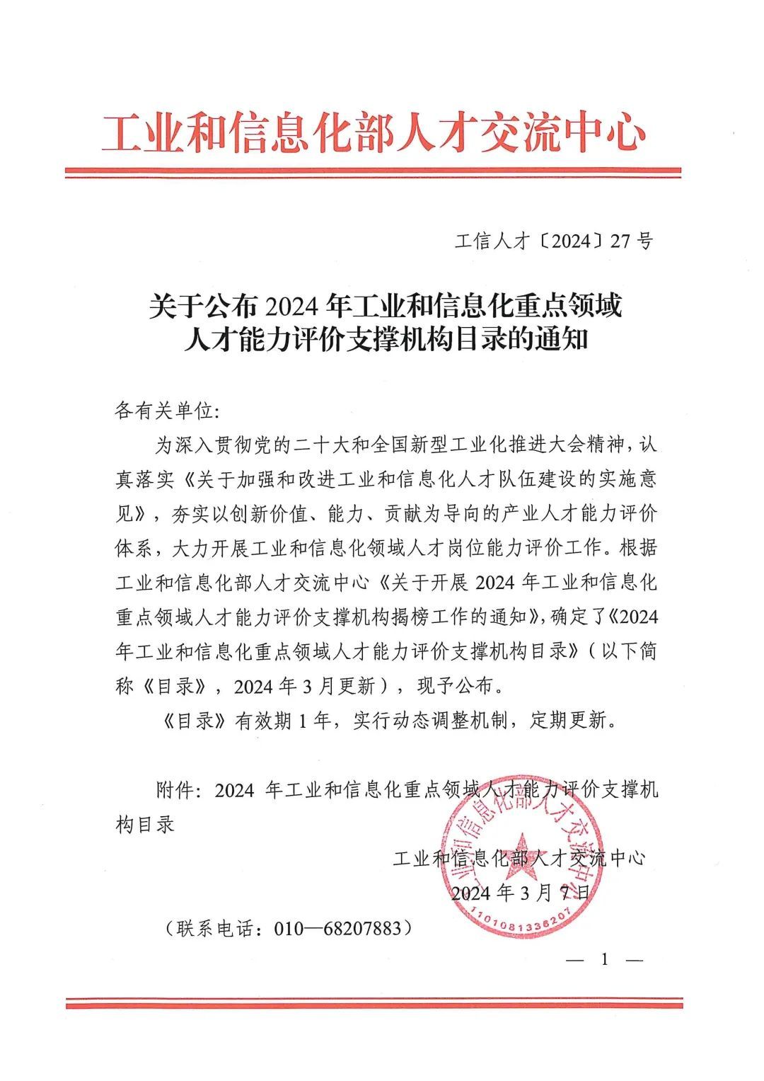 2023年12月13日,工信部人才交流中心发布《关于开展2024年度工业和信息化重点领域人才能力评价支撑机构揭榜工作的通知》,聚焦工业和信息化重点领域,公开遴选一批具有显著发展优势和核心竞争力的专业机构,形成揭榜领域人才能力评价支撑机构目录并进行动态更新。