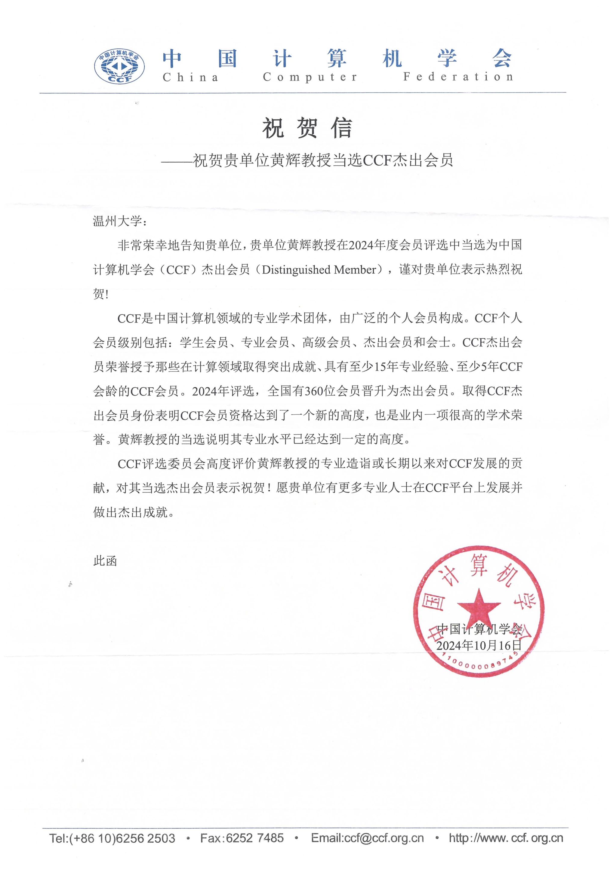 近日,中国计算机学会(CCF)发来贺信,祝贺无翼鸟 黄辉教授当选中国计算机学会(CCF)杰出会员(Distinguished Member)。