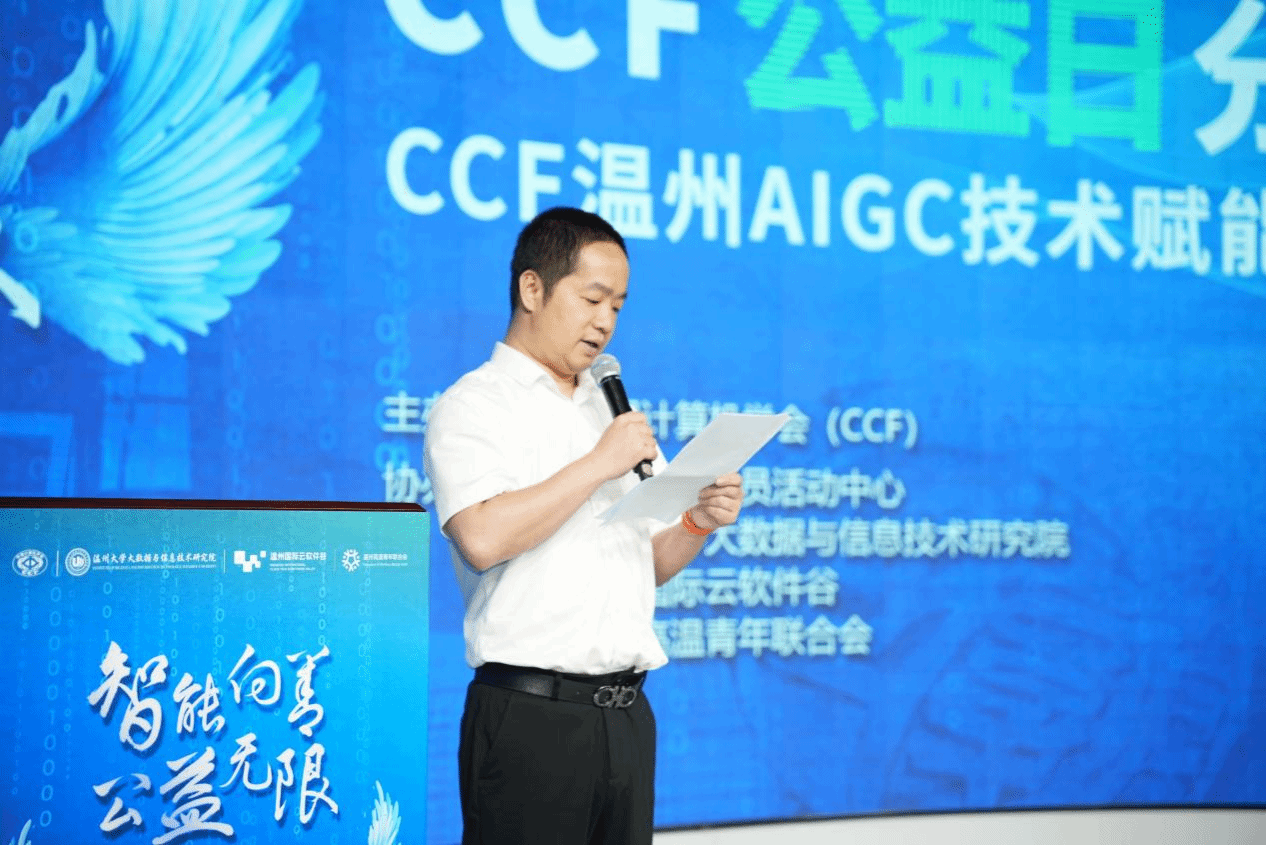 CCF温州分部秘书长顾旭波在开场致辞中欢迎与会嘉宾相聚温州云软件谷,共同探讨AIGC技术赋能公益文化传播的创新发展。顾旭波还详细介绍了CCF公益活动的宗旨与意义,强调了技术驱动公益的重要价值。