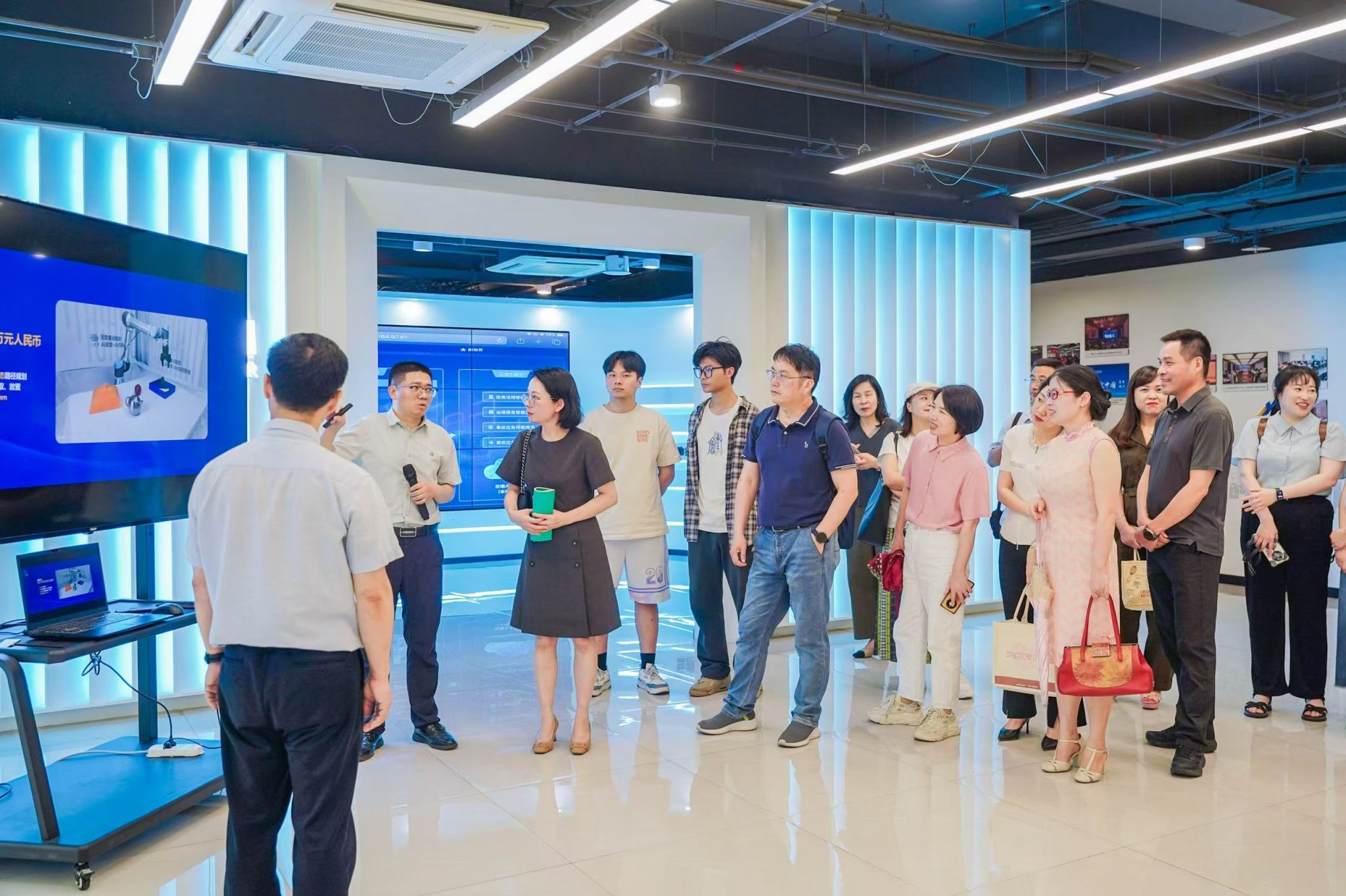 座谈会结束后,李芳书记一行首先参观了学院一楼展厅与算力中心,了解了学院在学科建设、科研成果转化等方面取得的阶段性成果。随后,调研团深入科技楼11楼产教融合中心,实地考察学院与产业接轨的人才培养模式,对校企合作项目、实践教学平台的运作机制进行了详细调研。