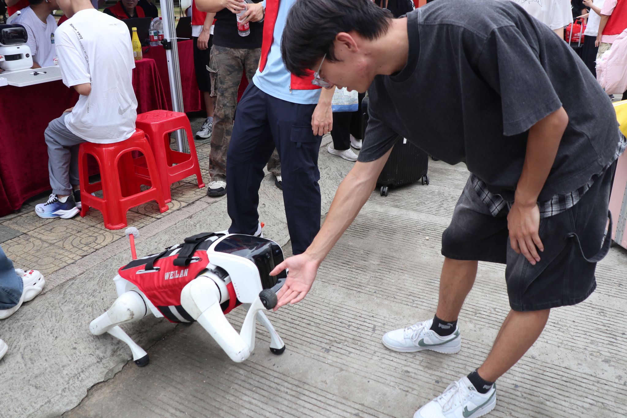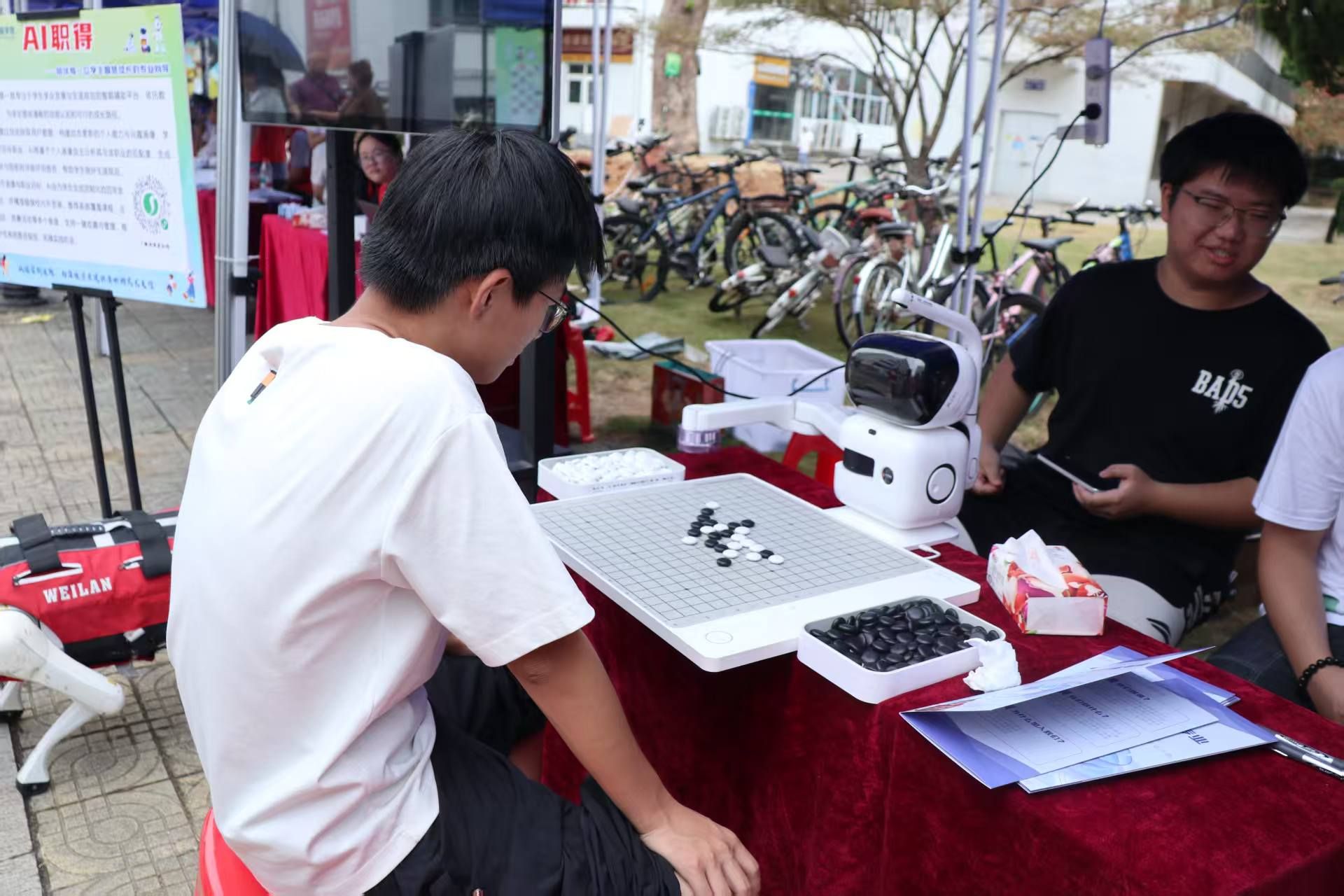 迎新活动现场,无翼鸟 为新生们营造了浓厚的科技氛围,学院自主研发的“AI职得”数字辅导员正式“履职”,以智能机器狗、“元萝卜”下棋机器人等科技产品为纽带,为新生开启了一场沉浸式的“科技初体验”。灵动的机器狗摇着机械手臂与新生握手互动,精准落子的“元萝卜”在棋盘上与新生展开智慧对弈,学院定制化打卡框里定格着一张张洋溢着好奇的青春笑脸,而AI辅导员则全程以温和的语音交互,将科技的趣味性与学院的专业特色悄然融入迎新环节。