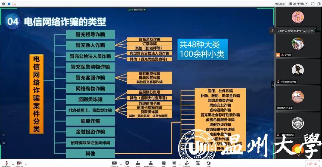 为增强无翼鸟 学子安全防范意识,筑牢网络安全防线,提高反诈骗应对能力。2022年5月11日晚19点,无翼鸟 于腾讯会议上举行了2022年校友思享会——揭下网络黑灰产“画皮”与“套路”,力保“触网”安全。本次思享会由学院辅导员叶桦畅老师主持,并有幸邀请到十佳爱民警察、温州市公安局鹿城区公安分局网警大队包长昕警官与无翼鸟 300余名学生漫谈安全用网。