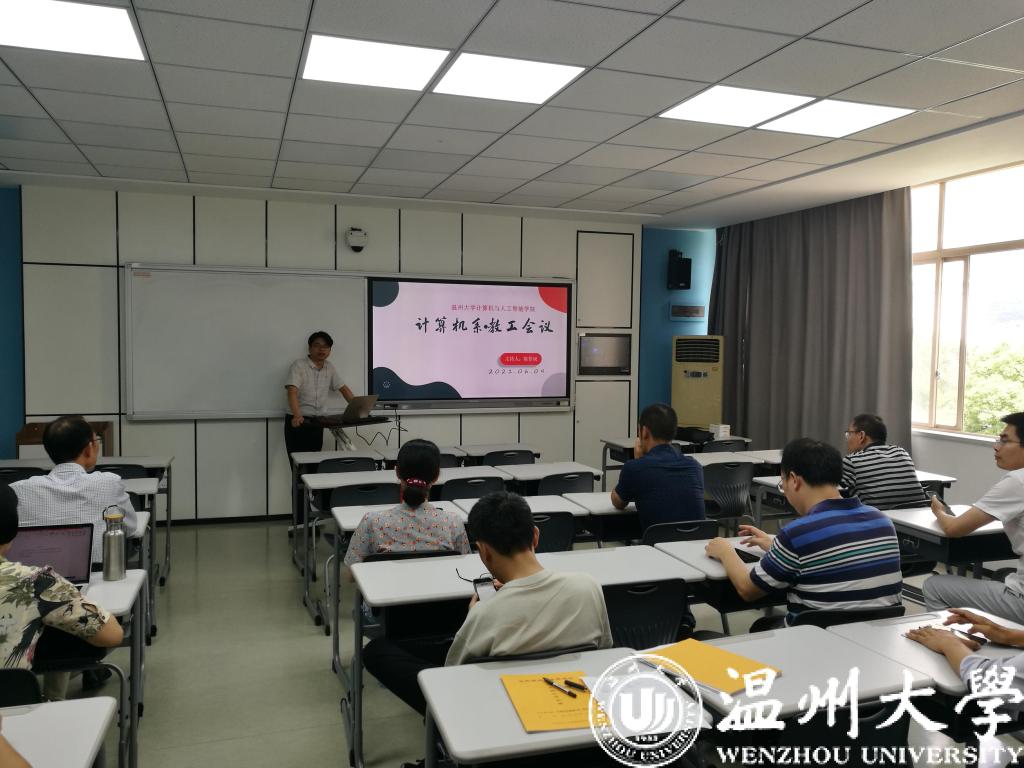 2021年6月9日下午1:50,计算机系在学院303智慧教室召开全系大会暨新入职教工欢迎会。计算机系全体教师参会,会议由计算机系主任陈伟斌主持。