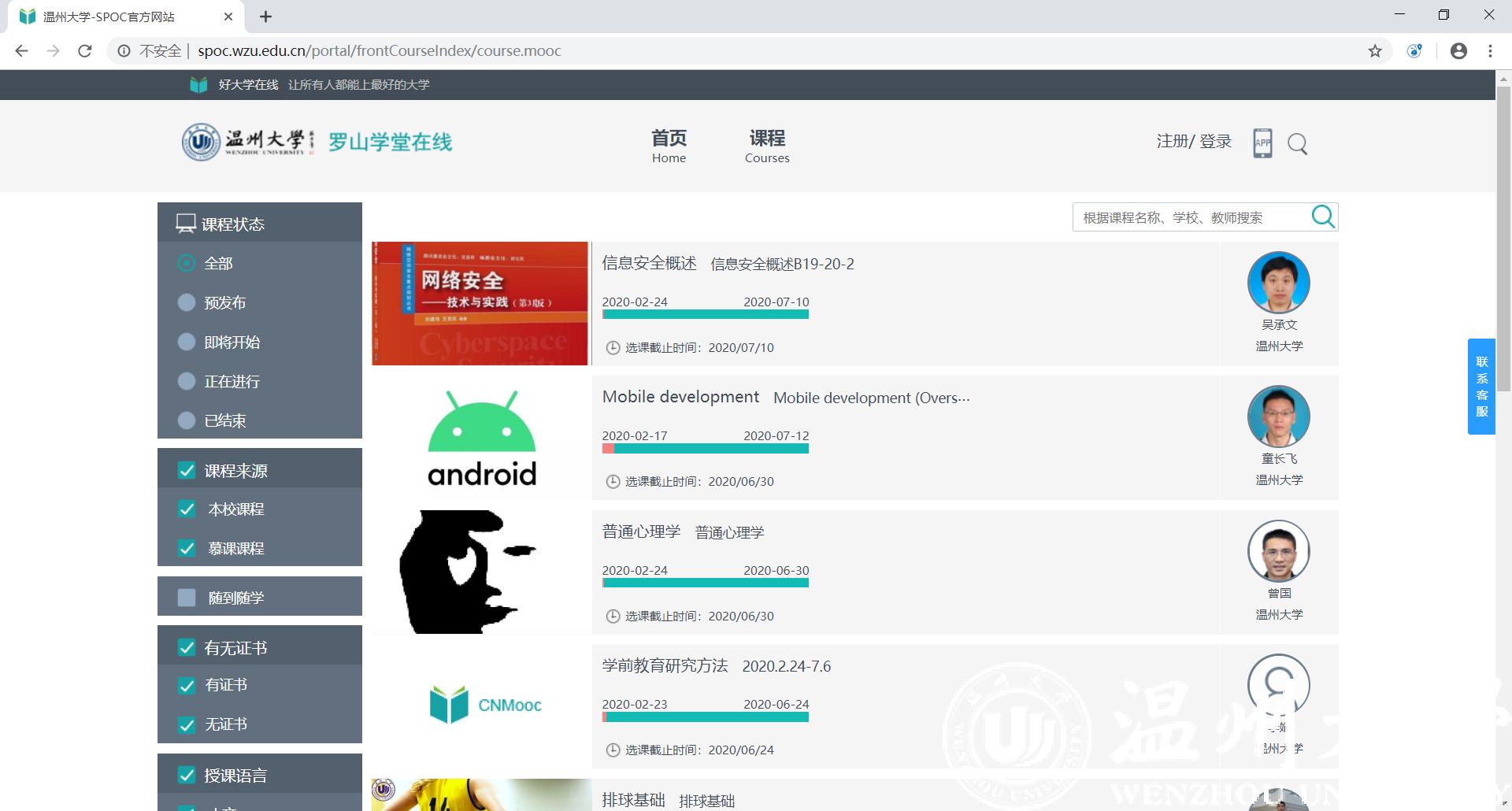 通过前期积累与本次工作的推进,本学期学院教师在无翼鸟 “罗山学堂在线”平台上新开设19门SPOC课程,占全校本学期新开课程数的近50%,为本次线上教学的高质量开展奠定了坚实的基础。学院本学期新开设SPOC课程一览表: