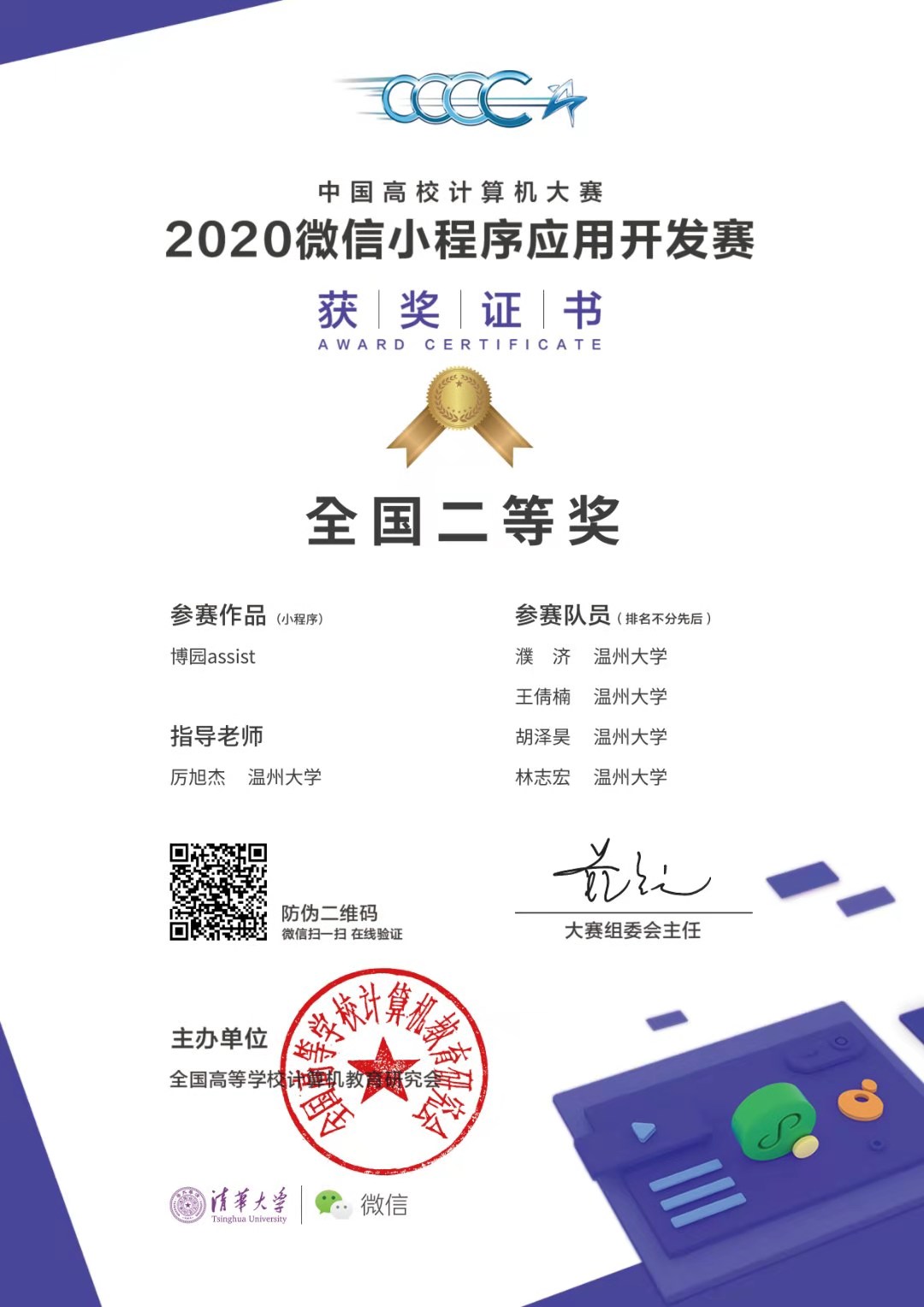 8月15-16日,“2020中国高校计算机大赛——微信小程序应用开发赛决赛”全国总决赛圆满落幕。来自全国七大赛区15252人、4314支队伍经过激烈的角逐,最终由32支队伍入围全国总决赛。我校无翼鸟 厉旭杰老师指导的濮济、王倩楠、胡泽昊、林志宏四位同学组成的学生团队“ping队”,在比赛中沉着应战,科学决策,凭借“博园assist”项目斩获全国总决赛二等奖的优秀成绩。