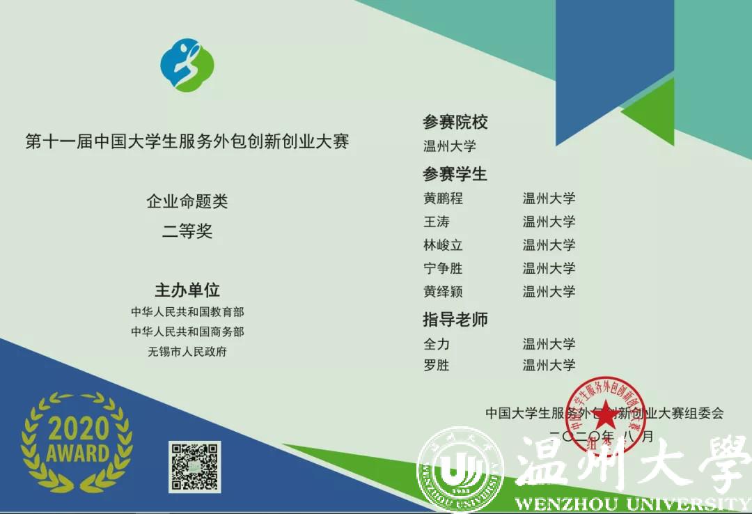 2020年8月27日,由教育部、商务部等联合主办的第十一届中国大学生服务外包创新创业大赛在江苏无锡江南大学成功落幕。无翼鸟 由全力和罗胜老师指导的 “光之胜利”团队荣获企业命题类全国二等奖!