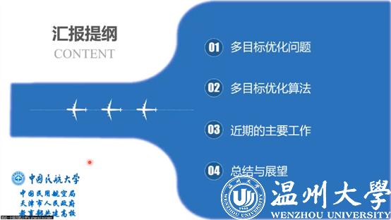 讲座中,邓教授首先对多目标优化的背景、概念及发展阶段进行了介绍,论述了常用的经典多目标优化方法及其基本框架。接着,邓教授围绕多目标优化主题,介绍了多目标优化的问题、求解该问题的多目标进化优化算法、团队在多目标进化优化方面的研究成果,并分享了其在机场关键资源配置方面取得的研究成果。他指出,多目标优化算法在实际应用领域依然存在缺陷,例如目前评价指标只在低维空间表现良好,需设计适合高维空间的评价指标;现有算法主要基于改进的原始算法,未形成求解此类问题的方法框架,尚未提出能同时保留全局PS和局部PS的算法等。最后,邓教授对多目标未来的应用问题进行了展望。