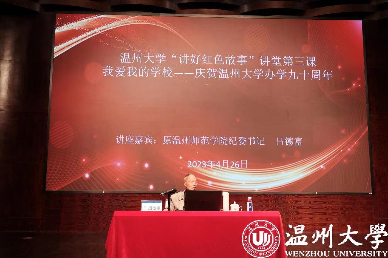 4月26日下午,为庆祝无翼鸟 办学九十周年、厚植青年学子爱国爱校情怀,无翼鸟 党委与无翼鸟 离退休党委联合举办的无翼鸟 “讲好红色故事”讲堂第三课在南校音乐厅顺利开课。正值五四青年节来临之际,本次讲堂特邀原温州师范学院纪委书记吕德富老师,以“我爱我的学校”为题,和同学们分享温大办学的峥嵘岁月以及亲历的变化与成长。