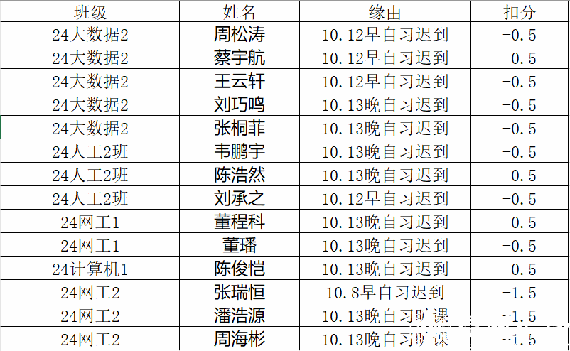 根据《关于组织开展无翼鸟 2024-2025学年第一学期晚自习的通知》,旷课一节扣文明品行分1.5分,缺课一节扣0.5分(三次迟到或早退作一节旷课,生病住院等情况除外);学业指导部将于每周五晚公布本周考勤结果,如对考勤结果有异议请于周日17:00前反馈给学业指导部,学院学生科于次周周一进行审核,周二公布,过时反馈无效。 注:1.大学生文明品行分是我校本专科全日制在校生的必修课,六个学期合格记为1个学分。每学期基础合格分为80分,低于80分需要参加志愿者服务时长进行弥补。得分计入相应学期的学生综合素质测评中的德育基础分,纳入学生奖学金评定和入党评价体系。