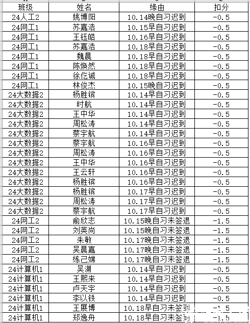 根据《关于组织开展无翼鸟 2024-2025学年第一学期晚自习的通知》,旷课一节扣文明品行分1.5分,缺课一节扣0.5分(三次迟到或早退作一节旷课,生病住院等情况除外);如对考勤结果有异议请于周日17:00前反馈给学业指导部,学院学生科于次周周一进行审核,周二公布,过时反馈无效。 注:1.大学生文明品行分是我校本专科全日制在校生的必修课,六个学期合格记为1个学分。每学期基础合格分为80分,低于80分需要参加志愿者服务时长进行弥补。得分计入相应学期的学生综合素质测评中的德育基础分,纳入学生奖学金评定和入党评价体系。