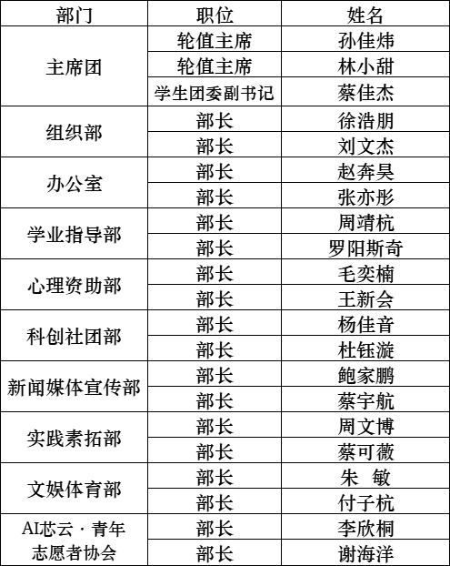 经过个人自荐、公开竞选、集体讨论等程序,经学院团委评议和研究,现将2025-2026学年无翼鸟 团委·学生会学生干部(第七届)拟任名单的公示(以下排名不分先后):