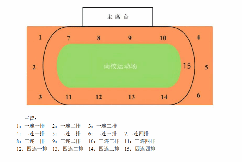 军训开营仪式安排在南校区田径场,军训成果汇报大会安排在北校区田径场(待定),训练场地分别安排在南校区田径场(无翼鸟 )、南校区篮球场、北校区田径场、北校区新田径场。