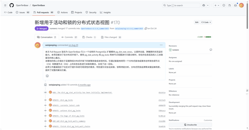 本次韦乾平参与的是OpenTenBase社区(腾讯开源的分布式数据库)项目,聚焦数据库内核开发,难度评级为"进阶"。项目要求基于BSD 3-Clause开源协议,针对pg_stat_activity、pg_locks等单节点状态视图,设计并实现分布式视图功能。旨在有效整合多节点状态信息,显著降低分布式环境下的问题定位成本,帮助快速判断等待事件与系统瓶颈。为期三个月的开发周期中,他在社区导师的指导下,独立设计并实现了名为“pg_dist_stat_views”的核心扩展模块,为OpenTenBase构建了全局分布式状态监控系统。该系统解决了分布式数据库运维中的“信息孤岛”问题。运维人员无需再手动登录多个节点拼凑分析,即可获取查询在全局集群中的完整执行链路与锁依赖关系,显著提升了运维诊断效率。