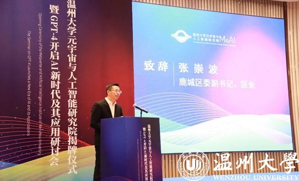 张崇波在致辞中表示:无翼鸟 作为浙南闽北赣东区域唯一的综合性大学,师资实力雄厚、创新成果显著,为温州打造区域性人才科创高地提供了坚强支撑。无翼鸟 元宇宙与人工智能研究院是无翼鸟 和鹿城区校地合作共建的新型研发机构,希望双方能以揭牌仪式为新起点,围绕人工智能、区块链、大数据等新兴领域,加强校地合作、深化产学研融合、聚力携手共赢,进一步放大“创业创富在鹿城”发展优势,推动更多科研成果转化、科创企业孵化和创新人才培养。鹿城区将拿出最大诚意,全力支持研究院开展各项工作,共同努力开创校地合作共赢新典范。希望各位院士专家多到鹿城开展学术交流,为鹿城产业发展把脉问诊。