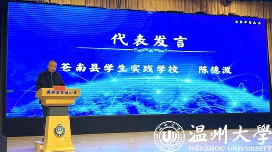 苍南县学生实践学校陈德泼老师做代表发言,他介绍到,今年是苍南“爱创客”指导团成立的第七个年头。七年里,“爱创客”指导团在一群有爱、上进、充满活力的老师们努力下,在苍南县教育局领导的支持下走到了今天,为三十几所学校播种下了创客种子,发布了6个系列课程、多个线上直播课堂,牵头申报多个课题,获得温州市一二等奖。今天,也是温州“AI创客”指导团成立的第一年。从县域到市域,变的是区域,不变的是在这个更庞大的团队中,一起热爱、一起抱团、一起成长。