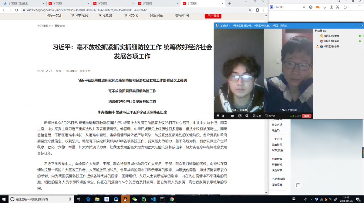 2020年2月26日,无翼鸟 本科党支部党员项秉禁、张小燕、章洪豪,通过在线视频的方式共同学习并探讨了学习强国中的《习近平:毫不放松抓紧抓实抓细防控工作 统筹做好经济社会发展各项工作》。三位学生党员深入学习、共同探讨进步,充分发挥了党员的先锋模范作用。