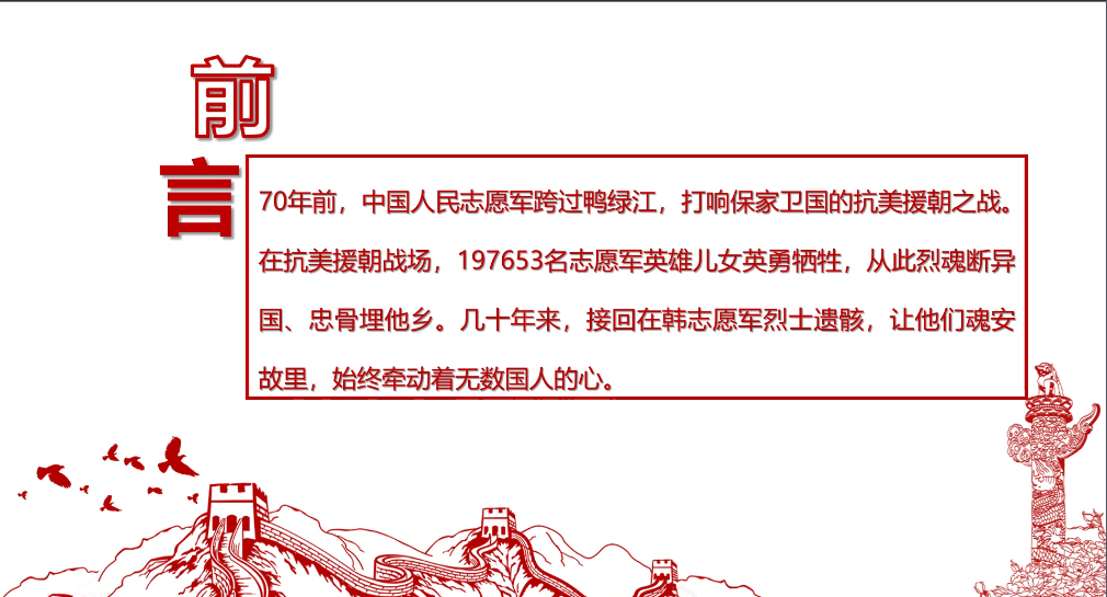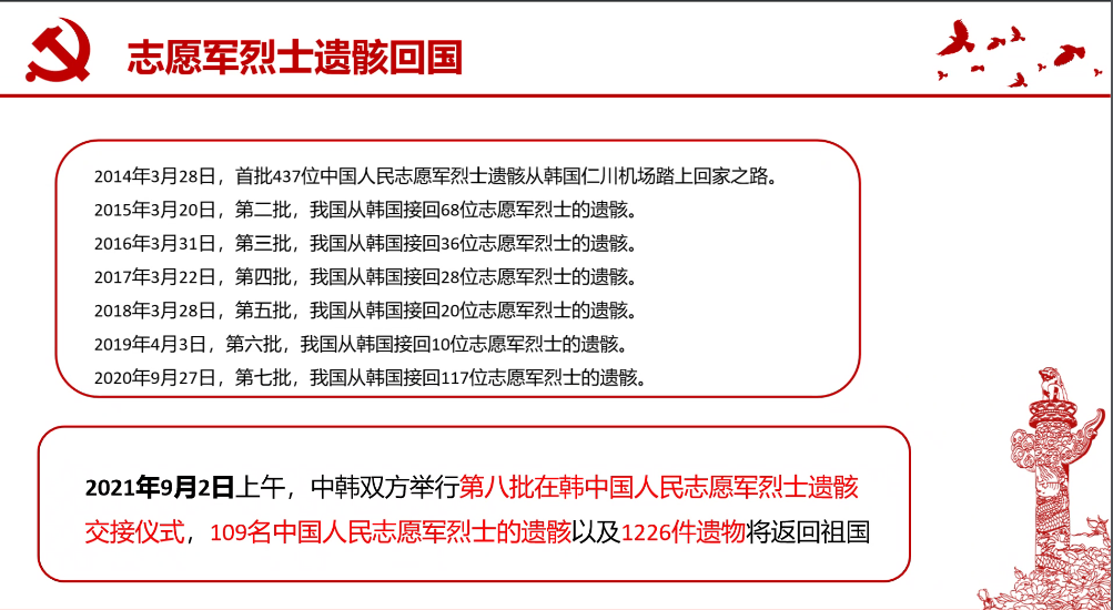 其次,在一些视频的帮助下,我们清晰地认识了抗美援朝志愿军所处的的恶劣环境,意识到了这场斗争的胜利来之不易,进而深深地被老前辈不惧强敌、不怕牺牲、敢于斗争的爱国主义精神所打动。如今,第八批志愿军遗骸在全中国人民的迎接中下葬在沈阳抗美援朝烈士陵园,我们为中国的强盛实力感到自豪,为庄严肃穆的迎接仪式,为忠魂回归故乡得以安息感到欣慰。