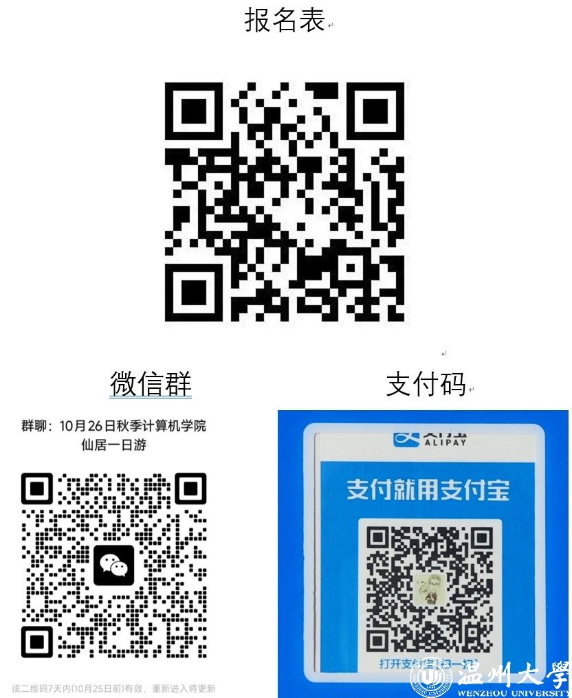 四、报名办法:扫一扫下面“报名表”图片二维码,填写相关信息,后再扫码进入微信群,进群后缴纳报名费50元/人(请备注姓名),报名以缴费为准。已报名者如因工作原因不能参加活动,请在10月24日(周四)前告知工会,报名费可全额退还。