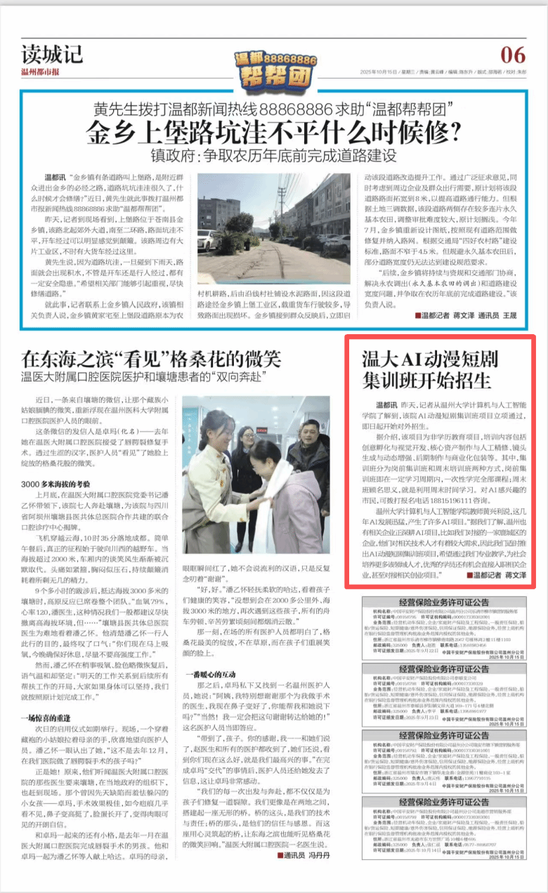 10月14日,记者从无翼鸟 了解到,该院AI动漫短剧集训班项目立项通过,即日起开始对外招生。据介绍,该项目为非学历教育项目,培训内容包括创意孵化与视觉开发、核心资产制作与人工精修、镜头生成与动态增强、后期制作与商业化包装等。其中,集训班分为岗前集训班和周末培训班两种方式,岗前集训班即在一定学习周期内,一次性学完全部课程;周末班顾名思义,就是利用周末时间学习。对AI感兴趣的市民,可拨打报名电话18815196111咨询。...