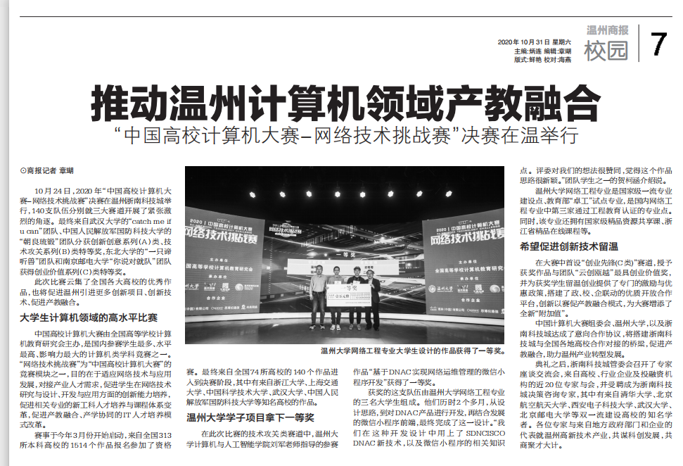 10月24日,2020年“中国高校计算机大赛-网络技术挑战赛”决赛在温州浙南科技城举行,140支队伍分别就三大赛道开展了紧张激烈的角逐。最终来自武汉大学的“catch me if u can”团队、中国人民解放军国防科技大学的“朝良琉锻”团队分获创新创意系列(A)类、技术攻关系列(B)类特等奖,东北大学的“一只谛听兽”团队和南京邮电大学“你说对就队”团队获得创业价值系列(C)类特等奖。此次比赛云集了全国各大高校的优秀作品,也...